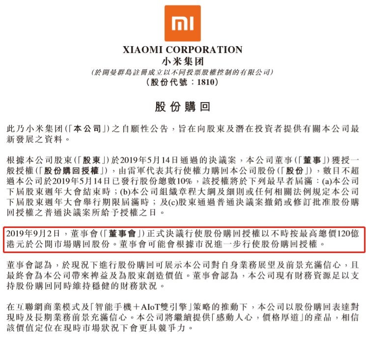 9月3日,小米集团(01810)发布自愿布告称,小米董事会将行使此前股东大会颁发的股份回购权力,在权力有用时间段内,将依照不超越120亿港元总价,不定期从揭露商场回购股份。