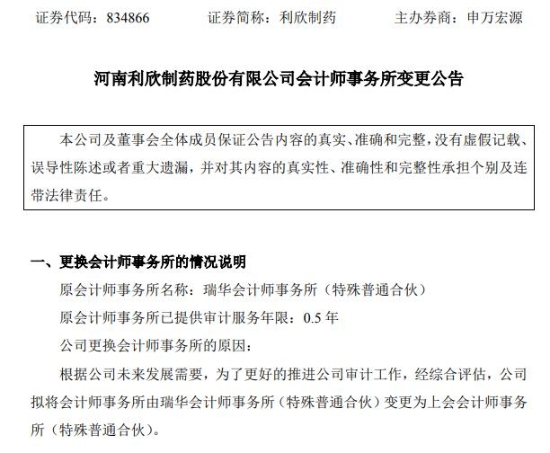 值得一提的是,在8月与瑞华解聘的公司中,利欣制药与瑞华的协作年限仅为半年。8月8日晚间,利欣制药发布管帐师业务所改变布告。在替换管帐师业务所的状况阐明一项中,利欣制药表明,原管帐师业务所瑞华已供给审计服务年限0.5年,公司替换管帐师业务所的原由于:依据公司未来发展需要,为了更好地推动公司审计工作,经归纳评价,公司拟将管帐师业务所由瑞华管帐师业务所(特别一般合伙)改变为上会管帐师业务所(特别一般合伙)。