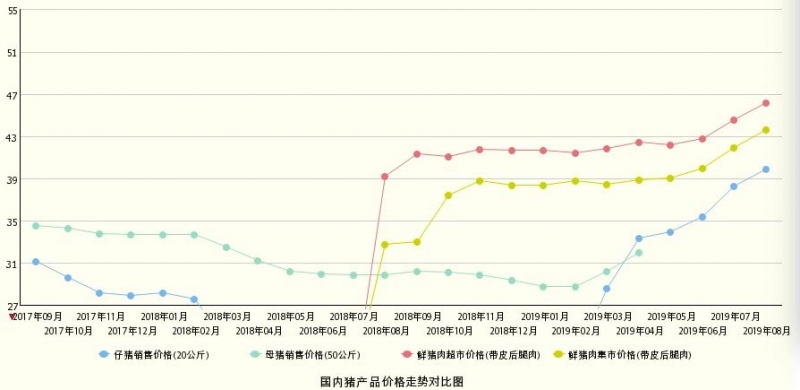 农业部数据显现:8月26日猪肉出厂价报价32.27元/公斤,到了8月30日达33.57元/公斤,上涨起伏较快。鲜猪肉超市价格在8月份到达46.25元/公斤,这一价格在去年同期为39.27元/公斤,上涨起伏较大。
