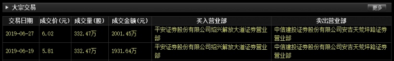另据深交所大宗生意平台发表,6月19日和6月27日,九更始材别离有2笔大宗生意,买入方均为安全证券绍兴解放大路营业部,卖出方均为中信建投证券安吉天荒坪路营业部,成交量也相同,均为332.47万股,生意金额别离为1931.64万元和2001.45万元。