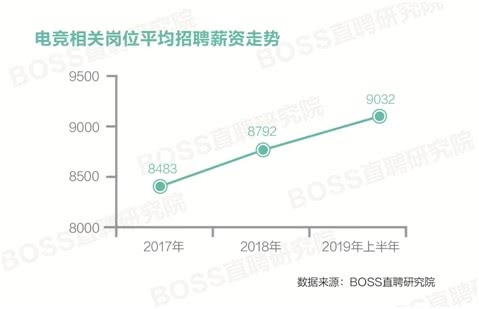 陈述显现,近三年,电竞作业招聘薪资逐渐提高。2019年上半年,电竞作业首要岗位的均匀招聘月薪到达9032元,比全作业全体均匀招聘薪资高出12.5%。