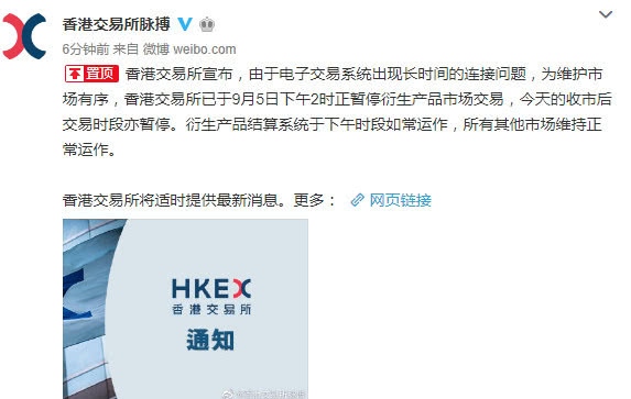 腾讯证券9月5日讯,香港生意所宣告,因为电子生意体系呈现长期的衔接问题,为保护商场有序,香港生意所已于9月5日下午2时正暂停衍生产品商场生意,今日的收市后生意时段亦暂停。衍生产品结算体系于下午时段如常运作,一切其他商场保持正常运作。