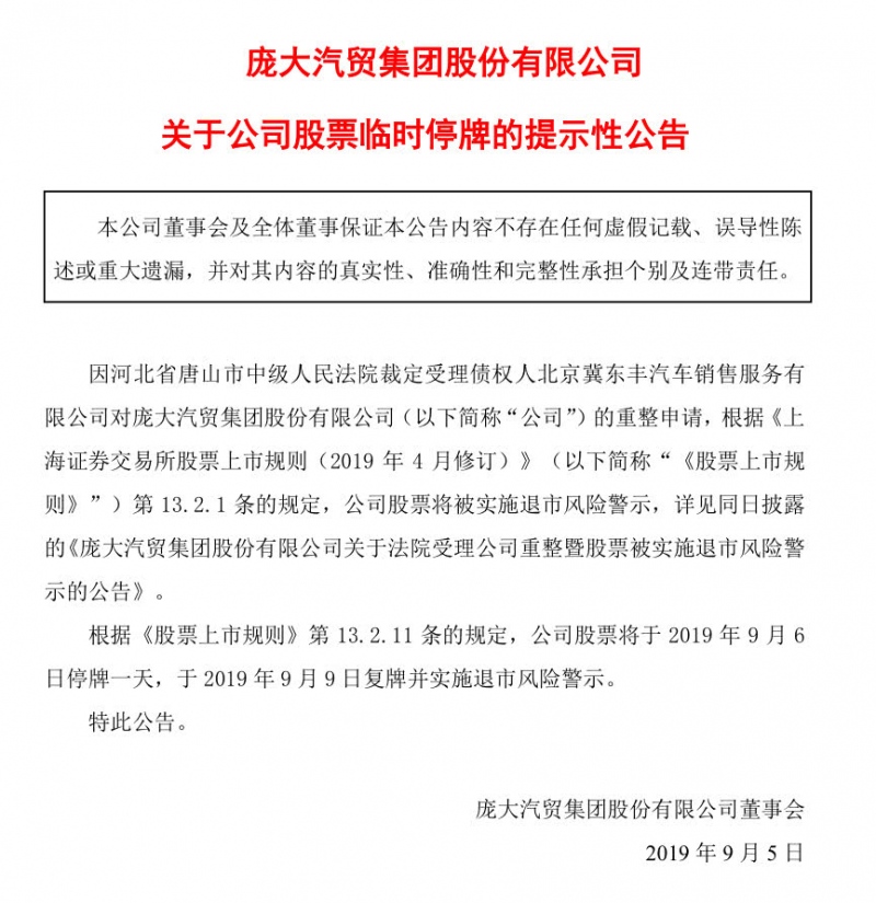 巨大集团昨夜发布公告称,因河北省唐山市中级人民法院裁决受理债权人北京冀东丰轿车出售服务有限公司对巨大集团的重整请求,该公司股票将被施行退市危险警示,股票简称该为“ST巨大”