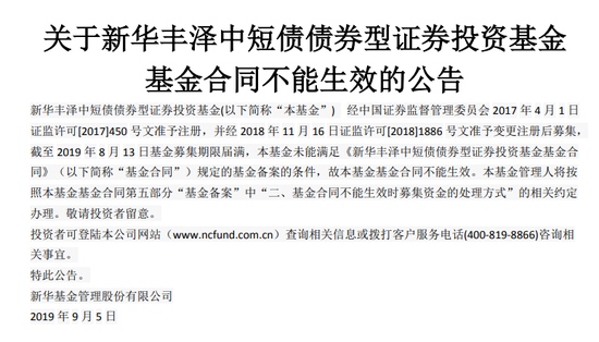 不过我国基金报记者注意到,有一家基金公司发布了旗下一只中短债基基金合同不能收效的布告。值得重视的是,这也是商场上首只征集失利的中短债基金。