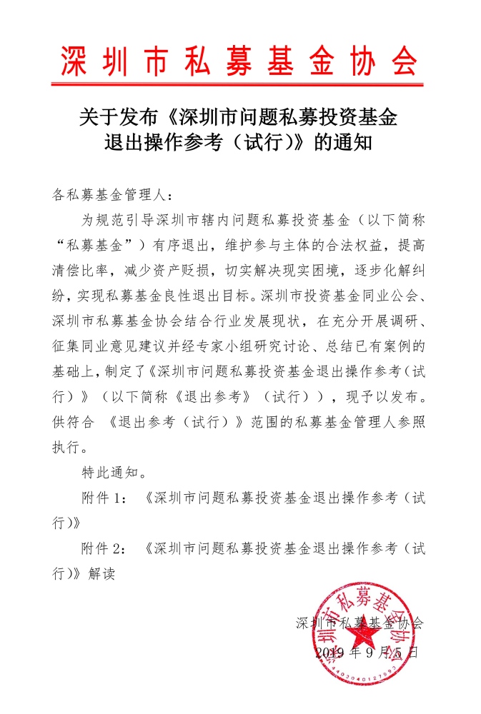 归纳来看,在全球经济环境多变的大布景下,“打破刚兑”是出资职业遵从的发展规律,是完成职业优胜劣汰的必定进程。深圳出台的《深圳市问题私募出资基金退出操作参阅(试行)》剑指私募基金退出进程存在的无序混乱状态,供给有序解决问题的处理程序和参阅计划,对深圳市私募基金职业的健康发展具有重要意义。