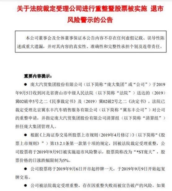 9月5日晚,A股上市公司巨大集团间发布布告称,因被法院裁决受理重整,公司股票将于2019年9月9日被施行退市危险警示,股票简称改为“*ST巨大”,股票价格的日跌幅限制为5%。