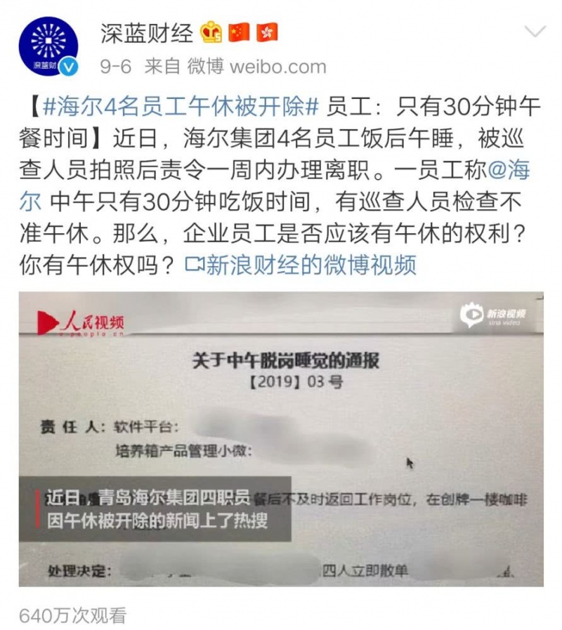 9月6日,一段海尔集团4名职工由于饭后午睡,被巡查人员摄影后责令1周内处理离任的视频,上了微博热搜。