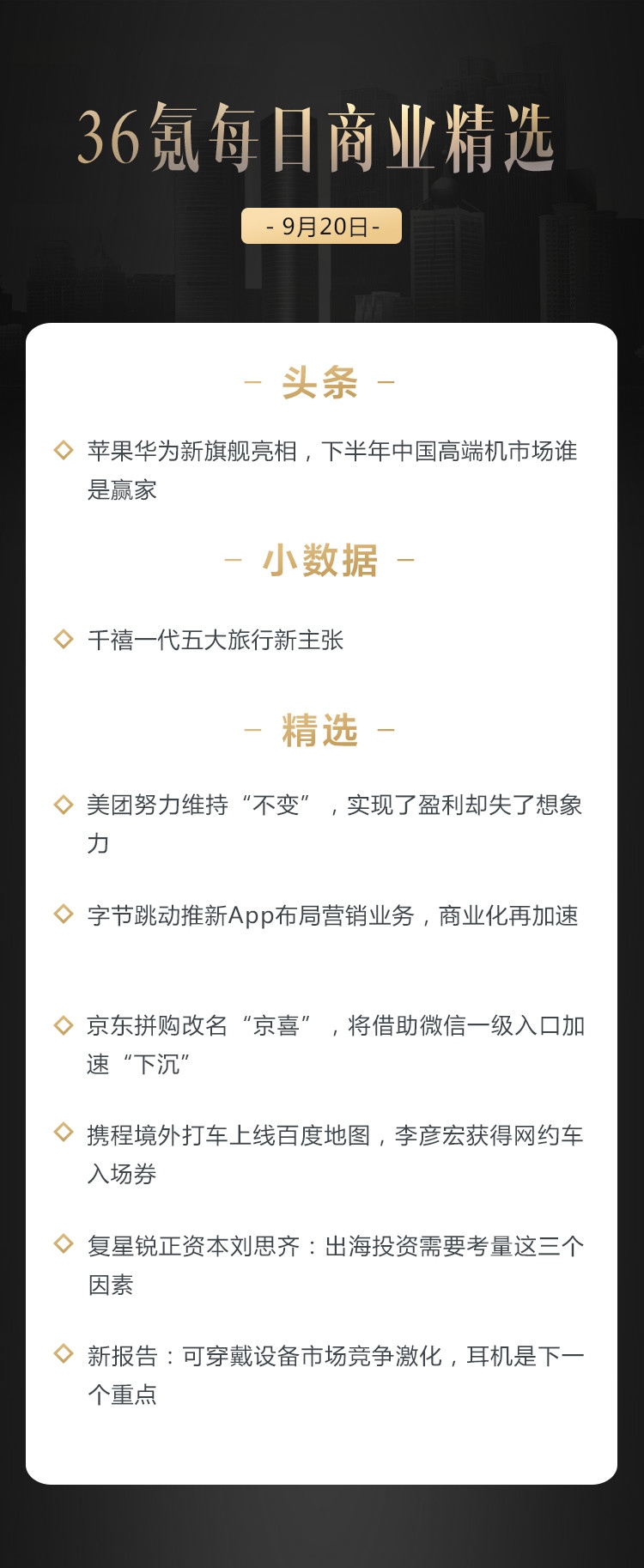 本文来自36氪付费栏目《36氪每日商业精选》——9月20日