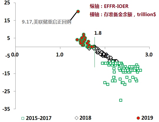 超量存款准备金余额与(EFFR和IOER)利差改变的联系