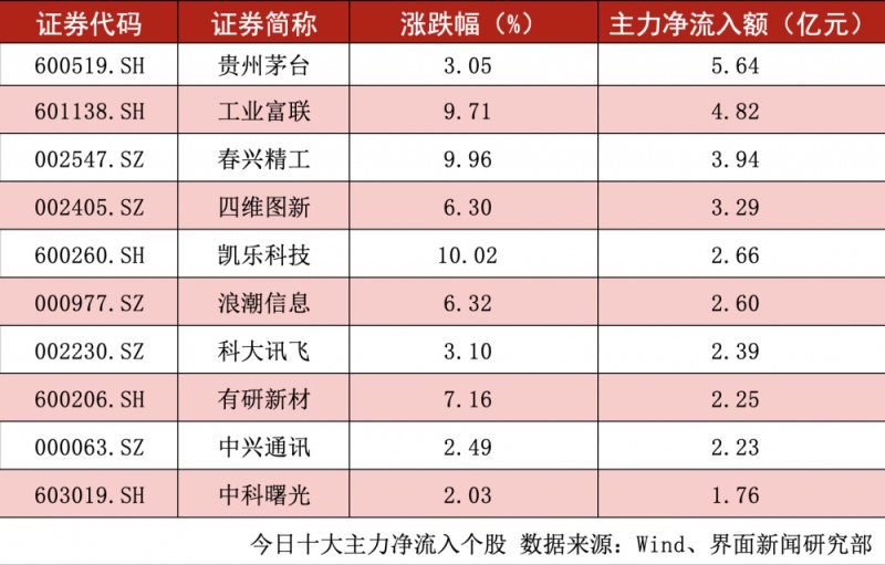 除掉没有开板的新股及科创板股票,全天沪深两市主力净流入额超越1亿元的个股数量为21个。贵州茅台(600519.SH)、工业富联(601138.SH)、春兴精工(002547.SZ)的主力净流入额位居前三,别离为5.64亿元、4.82亿元、3.94亿元。