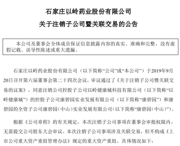 9月21日,以岭药业布告称,公司决议刊出公司控股子公司以岭健康城的控股子公司康碧园和康碧园的全资子公司康碧园(中山)。二者别离树立于2017年和2018年。