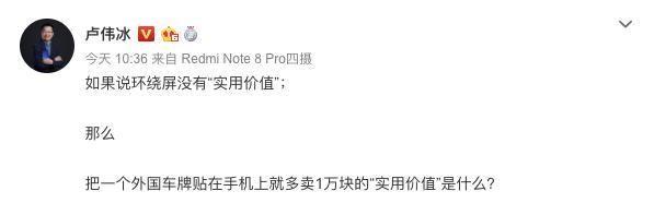 三言财经9月27日音讯,今天上午,小米集团副总裁、红米Redmi品牌总经理卢伟冰发微博回应“小米MIX Alpha概念机”没有实用价值一事。他表明,假如盘绕屏没有“使用价值”,那么把外国车牌贴手机上多卖1万块也没什么价值。