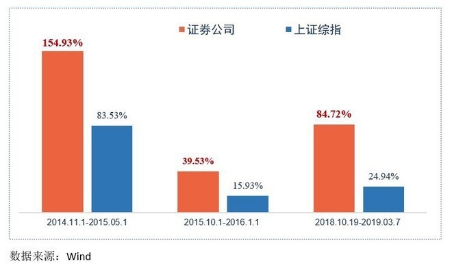 比方2018年10月19日至2019年3月7日的区间内,证券公司指数涨幅达84.7%,涨幅是沪深300指数(25.1%)的3.4倍,是上证综指(17.8%)的4.8倍,高弹性特点显着。