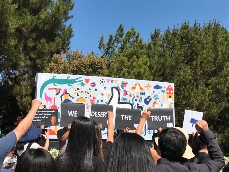 从现场相片和视频能够看出,当天,数百名示威者身穿黑衣,手举“求公平”(Justice)、“还我本相”(We deserve the truth)、“公平对待职工,他们才不会上你的网去找新作业”(Treat your employees right so they won’t use your internet to look for new jobs)等标语,高喊“我国人的命也是命”、“还我本相,扎克伯格”、“对立有毒的作业环境”等标语,要求脸书公司彻查陈秦跳楼背面原因,并反思内部文明,给咱们一个本相。