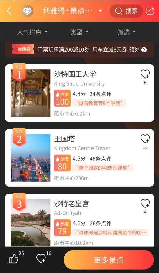 据悉,现在,在线渠道只要“自在行”相关的产品,暂无沙特固定行程游相关产品。例如,在携程“自在行”系列中显现,“沙特阿拉伯利雅得+吉达5日-30日自在行”的产品中,从预定时刻上来看,最早可预定10月10日的旅行产品。预定费用为每人8328元起,1晚起订。现在,沙特国王大学、王国塔、沙特老皇宫为利雅得景点人气榜前三位。