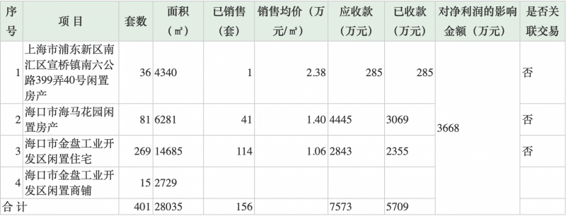 依据布告,海口两个住所项目累计售出155套,海马花园拟出售81套,共6281平方米,现在售出41套,成交的均匀单价为1.4万元,应收款4445万元,已收到3069万元;创业新村拟出售269套住所,共14685平方米,已出售114套,成交的均匀单价为1.06万元,应收2843万元,已收款2355万元。