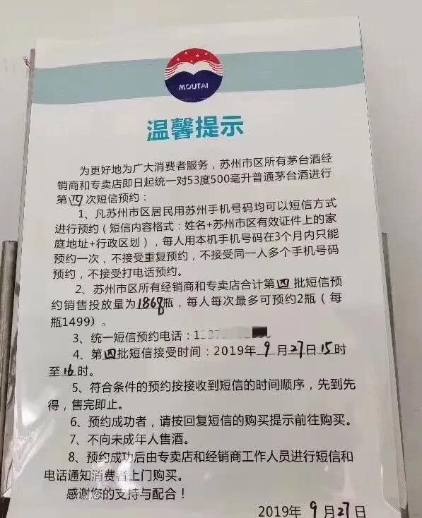 网友发布的《温馨提示》上写明晰对预订方法的规矩:凡姑苏市区居民,用姑苏手机号码,均能够短信方法(特定的内容格局)进行预订。每人用本机手机号码在3个月只能预订一次,不接受重复预订,不接受同一人多个手机号码预订,不接受打电话预订,每人每次最多可预订2瓶。