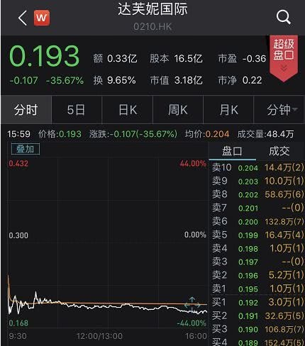 港股上市公司达芙妮世界(0210.HK),最近两日股价呈现闪崩、接连暴降,累积跌幅到达近60%,市值蒸腾了4.73亿港元,最新股价只要0.193港元。