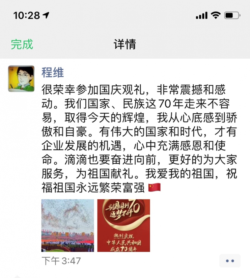 10月1日,中华公民共和国建立70周年阅兵仪式在北京举办。滴滴出行创始人、董事长兼CEO程维在天安门广场观看了仪式,观看了这70年来国家获得的光辉成就,他表明十分骄傲、骄傲与激动。