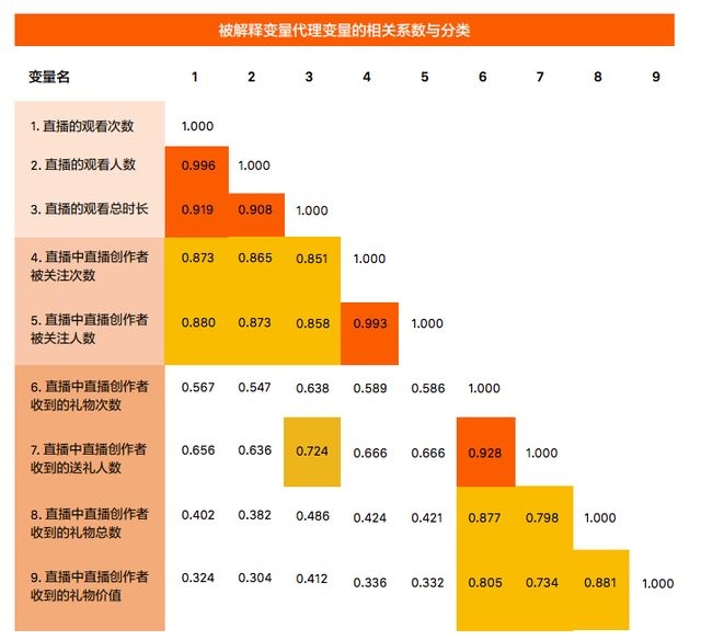 举例来说,直播中创造者收到的礼物次数与送礼人数的相联系数为0.928,这一系数越高,阐明两个变量的相关程度越高。