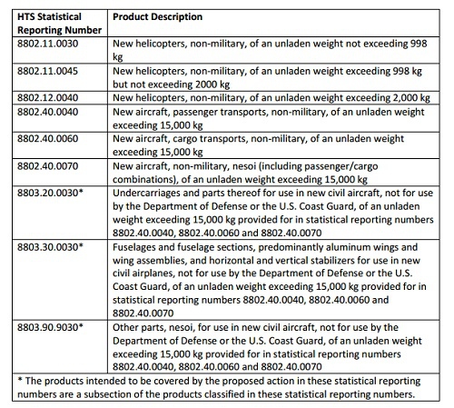 依照此前美国交易办公室(USTR)所拟定的方案,美方将报复的规模设定为两组。一组针对空客的四个制作国——法国、德国、西班牙及英国,一组则针对广泛的欧盟28国,在针对法国、德国、英国和西班牙四国的榜首组中,首要拟征关税的产品包含直升机、货运飞机,以及一些飞机零部件产品。