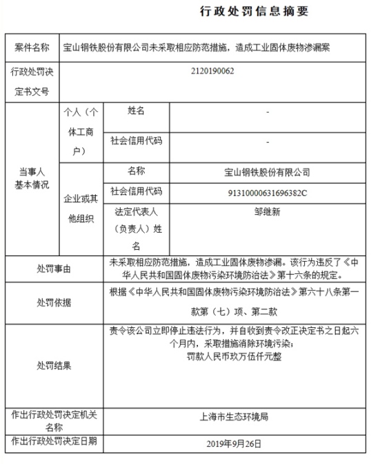 我国经济网北京10月4日讯 上海市生态环境局于9月27日对宝山钢铁股份有限公司(以下简称:宝钢股份,股票代码:600019.SH)下发行政处罚,行政处罚决定书(文号:2120190062)显现,宝钢股份未采纳相应防范办法,形成工业固体废物渗漏。该行为违背了《中华人民共和国固体废物污染环境防治法》第十六条的规则。