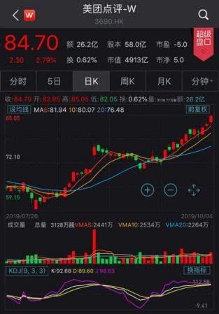 到今天港股收盘,美团点评再刷前史新高。盘中一度触及85港元高点,收盘上涨2.79%报收84.70港元。美团点评股价近来连续强势上涨态势,年内累计涨幅现已高达105%,最新市值4913亿港元。