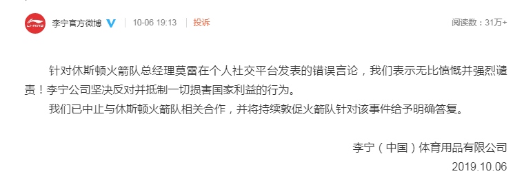 e公司讯,李宁官微今天发布声明:针对休斯顿火箭队总经理莫雷在个人交际渠道宣布的过错言辞,咱们表明无比气愤并激烈斥责!李宁公司坚决对立并抵抗全部危害国家利益的行为。咱们已间断与休斯顿火箭队相关协作,并将继续敦促火箭队针对该事情给予清晰答复。