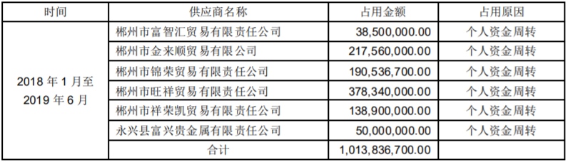 9月7日,金贵银业回复重视函表明,曹永贵因本身资金周转需求,经过部分供货商与公司供给协作的联系,由公司向部分供货商预付货款,供货商收到预付款后部分金钱应其要求转至指定账户。自2018年1月至2019年6月期间,曹永贵经过郴州市六家供货商累计占用上市公司资金10.14亿元,期间日最高占用额14.42亿元。