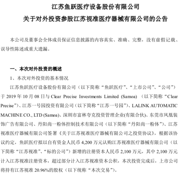 10月8日,鱼跃医疗布告称,拟以自有资金人民币 4200 万元认购江苏视准医疗器械有限公司(以下简称“江苏视准”)20.96%的股权。