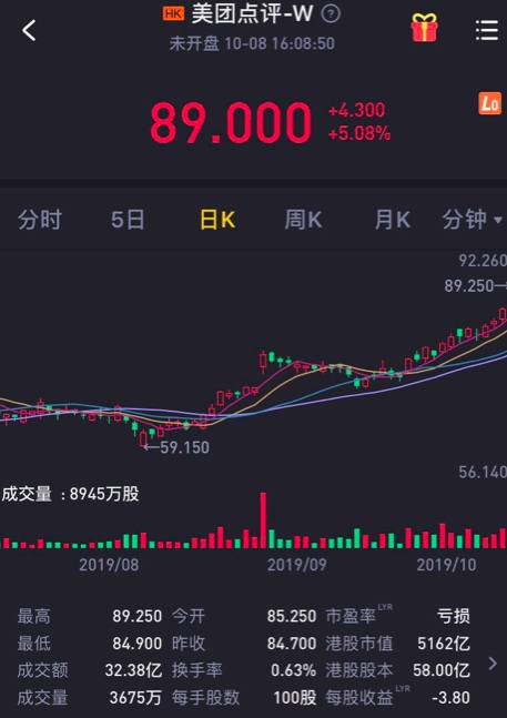 2019年10月8日,美团点评(03690.HK)收盘报89港元/股,较上一买卖日上涨5.08%,盘中触及89.25港元/股的前史高位,市值到达5162亿港元(约合658亿美元),仅次于当日阿里巴巴(4283亿美元)和腾讯(3.09万亿港元,约合3943亿美元),成为我国国内第三大已上市的互联网企业。