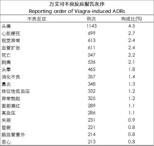 在陈亮等,11962例枸橼酸西地那非(万艾可)不良反应报告分析中显示,万艾可不良反应报告最多的为头痛,占4.5%,其他发生较多的不良为心肌梗死(2.7%)、血管扩张(2.4%)、视觉异常(2.4%)、死亡(2.2%)、胸痛(2.1%)。报告认为,万艾可不良反应以累及心血管系统最为常见,应规范西地那非的临床应用。
