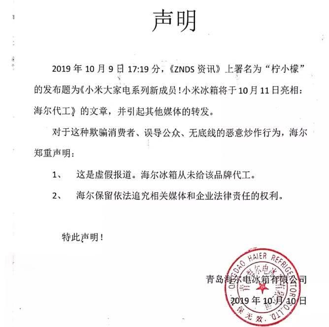 稍早前,海尔冰箱发布声明称, “这是虚伪报导。海尔冰箱从未给该品牌代工。海尔保存依法追究相关媒体和企业法律责任的权力。”