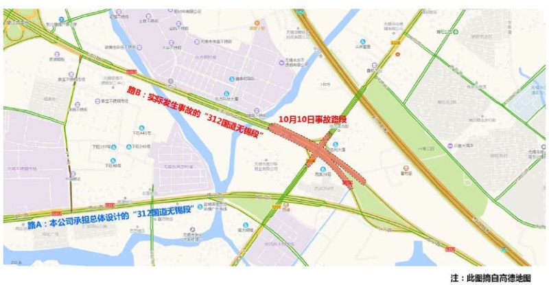 报导所称的本公司承当总体规划的“312国道无锡段”见下图路A,而实践发作事端的“312国道无锡段”见下图路B,事端桥梁的规划与本公司无关。