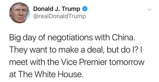 美国总统特朗普周四发推称,他将于周五与我国国务院副总理刘鹤举办接见会晤。这条推文暂时缓解人们对商洽或许缺少开展的忧虑,并这使人们对本周高等级买卖商洽获得活跃效果感到达观。