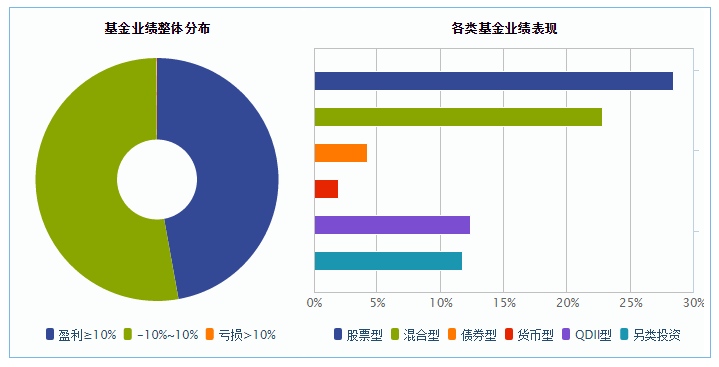本年以来,基金商场全体趋好。到9月30日,各类基金均匀收益率全线飘红,基金总指数涨幅15.62%,超越47%的基金收益率超越10%。其间,股票型基金体现最为优异,均匀收益率28.31%,居于各类基金成绩体现的首位,混合型基金成绩体现紧随其后,均匀收益率为22.77%;QDII型基金收益率低于前两类基金,均匀收益率为12.39%;债券型基金和钱银型基金收益率别离为4.23%和1.91%。