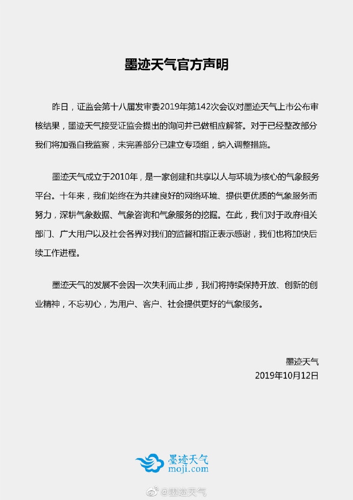 (原标题:墨迹气候回应IPO被否:承受证监会提出的问询并已做相应回答)