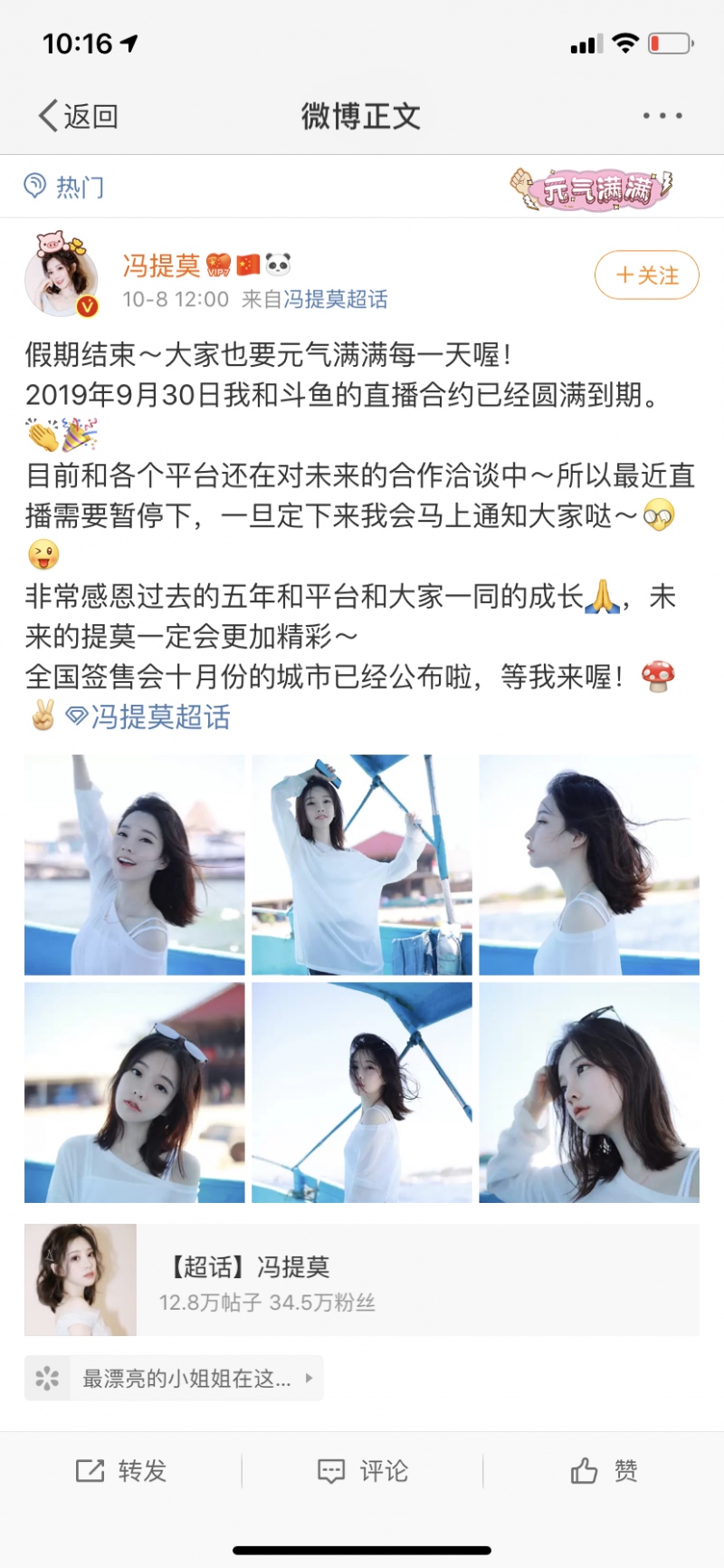 10月8日,歌手、主播冯提莫在其个人微博账声称:“到2019年9月30日,我和斗鱼的直播合约现已满意到期,和各个途径的未来协作还在洽谈中。”平平官宣背面,也流显露网红保鲜的窘境,以及主播向明星跃升的难题。