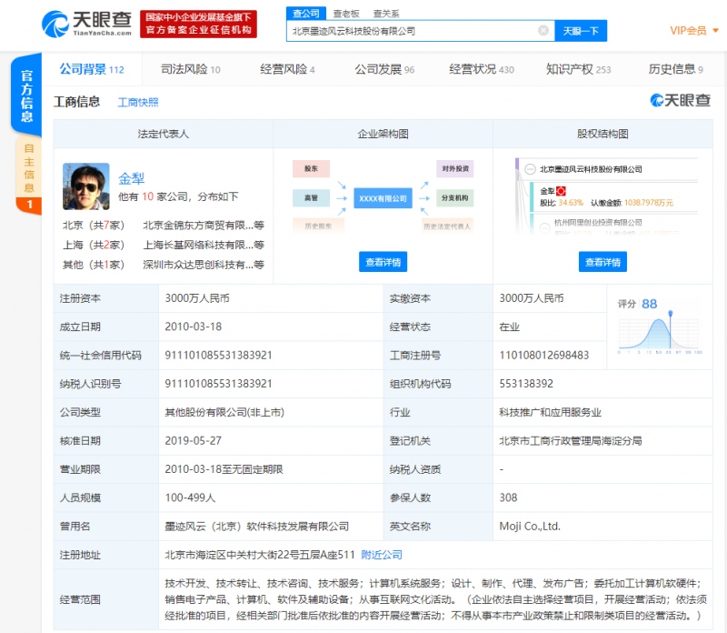 天眼查数据显现,北京墨迹风云科技股份有限公司成立于2010年3月,注册资本3000万人民币,法定代表人为墨迹气候CEO金犁。该公司的最大股东、终究获益人为金犁,持股份额为34.63%,第二大股东为由马云持股80%的杭州阿里创业出资有限公司,持股份额15.5%。墨迹气候的其他股东还包含北京立异工场出资中心(有限合伙)等。