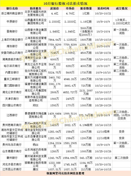 基金君查询了阿里司法拍卖渠道,10月触及“银行股权”的拍卖十分多,据不完全核算,标的起拍金额在1000万以上的就有20多起。