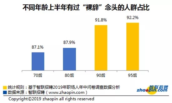 上一年,日剧《大叔的爱》中这句台词刷了屏。继“佛系”、“秃了”之后,这届90后又多了一个标签——裸辞。本年6月,智联招聘发布的《2019职场人年中盘点陈述》显现,90.4%的人上半年动过裸辞的想法。从70后到95后,这个份额逐步进步。