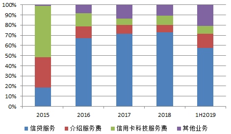 转折点就发生在2019年。51信誉卡2019年上半年信贷促成及服务费收入8亿元,同比下滑13.9%,在营收中的占比从去年同期的73.2%骤降至57.4%。