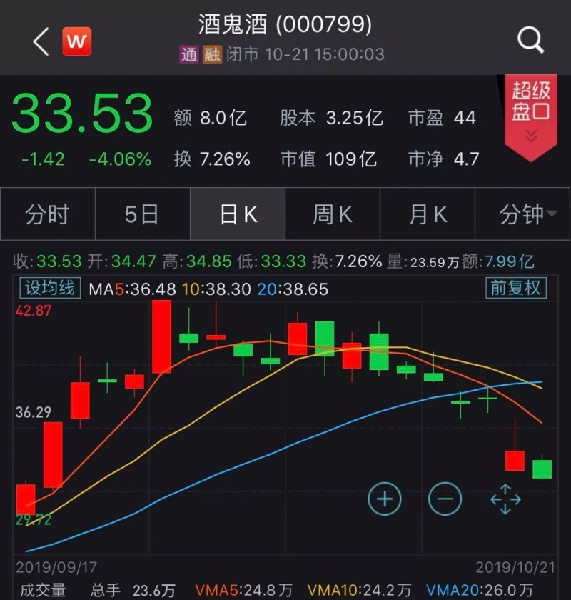 关于这份始料未及的成绩单,商场的反响可谓敏捷且生猛。第三季度财报发布当日晚间,有投资者直呼“成绩暴雷”。次日,酒鬼酒股价应声大跌,质疑声四起。10月18日上午,我国尖端投行中金公司下调酒鬼酒评级至中级,方针价至33元。10月18日收盘时,酒鬼酒现已跌至34.95元。