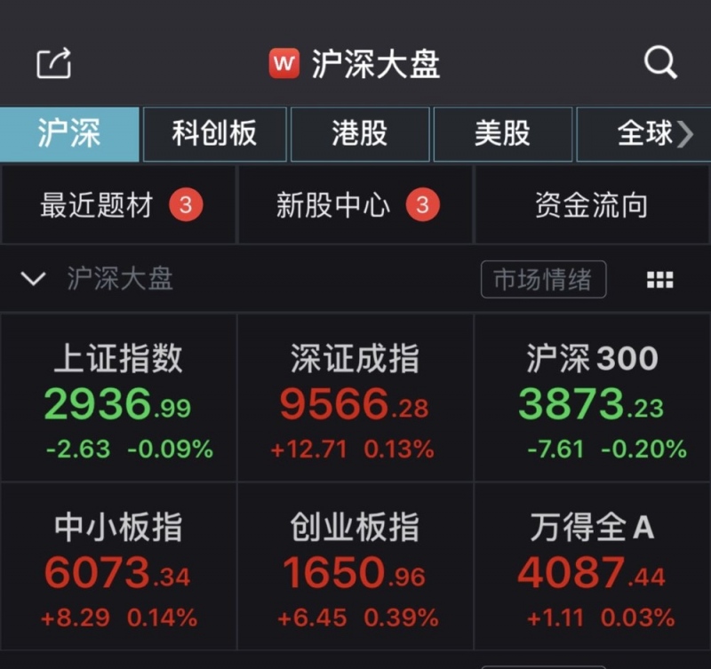 到午间收盘,沪指跌0.09%,报收2936.99点;深成指涨0.13%,报收9566.28点;创业板指涨0.39%,报收1650.39点。沪股通净流入0.45亿,深股通净流入1.72亿。