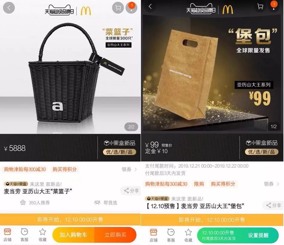 从麦当劳我国天猫旗舰店可查询到,全球定量300只的“黑金篮子”预价格格为5888元,品牌方称规划构思源于野餐篮。而外号为“堡包”的一款手包预价格为99元,则是由麦当劳的外卖纸袋罗致的构思。
