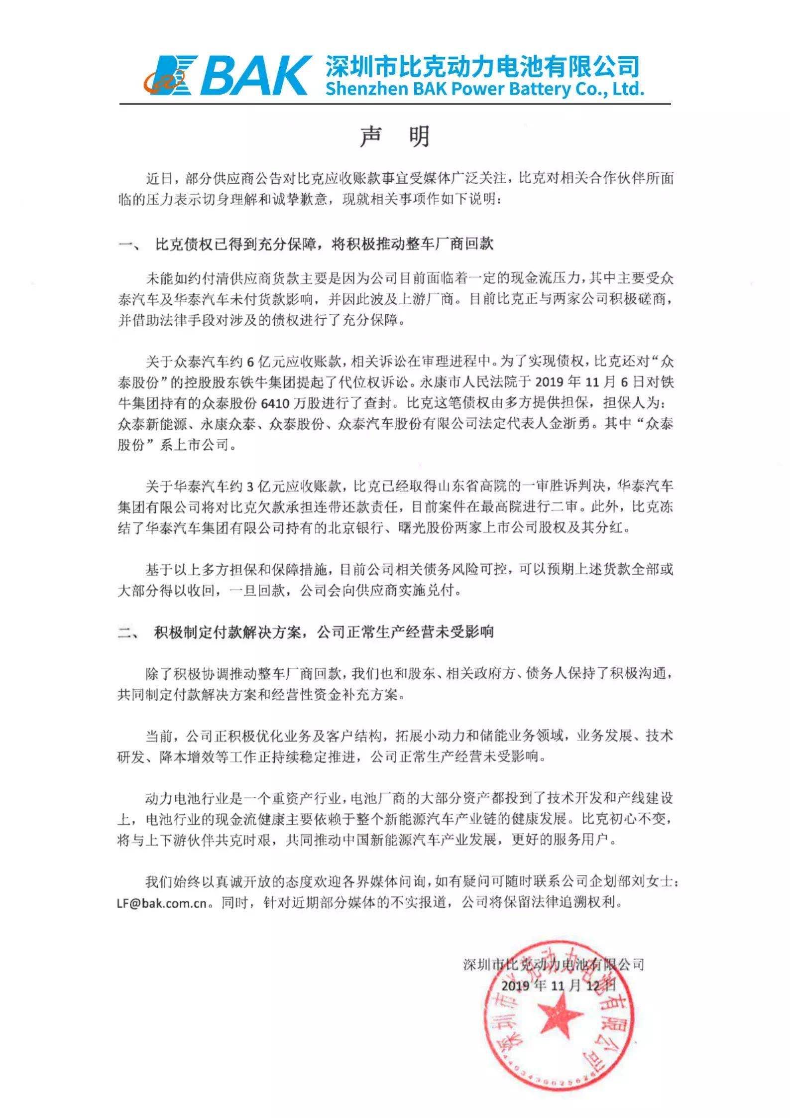 比克电池对众泰一事的布告 来历:比克电池官方