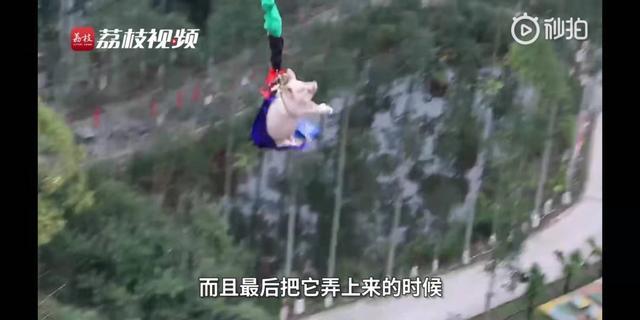 18日,重庆某景区蹦极项目开业当日,工作人员拉来一头肥猪蹦极,引发热议。