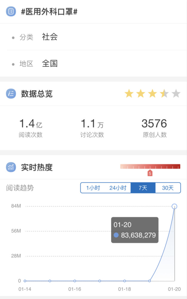 医用外科口罩在微博上的阅览趋势短期内暴增。
