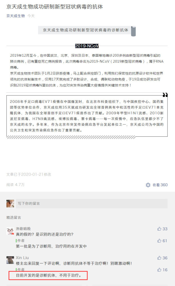 京天成生物表明,现在开发的是确诊抗体,不用于医治。