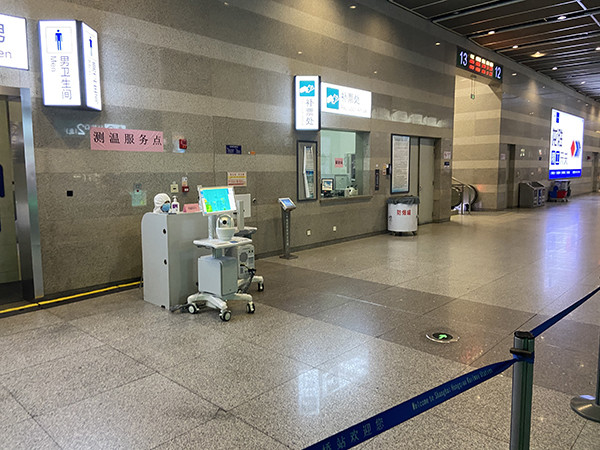 2号航站楼出去前,每位旅客要先排队测温,担任测温的是红外热像仪设备,瞬时便可显现体温状况,一点点不影响人们出站的次序。
